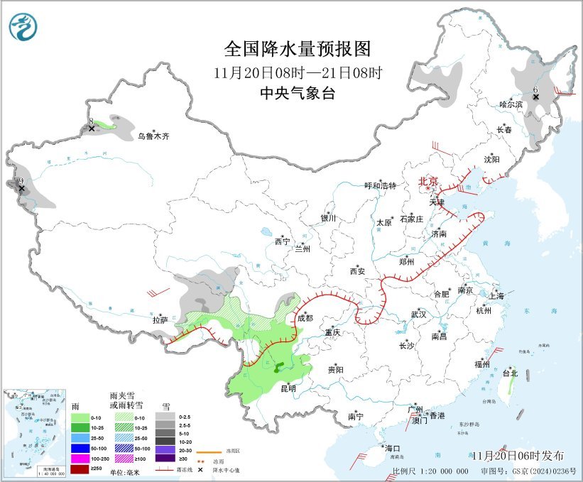 全国降水量预报图(11月20日08时-21日08时)
