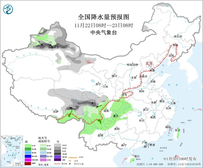 11月22日08时至23日08时,新疆北部和东部、甘肃西北部、青海南部、西藏东部、川西高原中北部等地部分地区有小到中雪或雨夹雪,其中,新疆沿天山地区和伊犁河谷、西藏东部、川西高原北部等地部分地区有大到暴雪,局地大暴雪(20~25毫米)。新疆伊犁河谷、西藏东南部、陕西南部、川西高原南部、云南北部、四川盆地东部和南部、贵州西部、重庆等地部分地区有小雨,局地有中雨。内蒙古西部、甘肃北部等地部分地区有5~7级风、阵风8~9级;南海北部和中部等部分海域将有5~7级风、阵风8级。