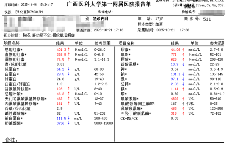 随后,小高出现高热、肌肉剧痛、全身黄染及茶色尿等症状,被医院诊断为 “脓毒症、横纹肌溶解、多器官功能障碍(累及心、肝、肾、血液系统)”,病情持续恶化。当他转至医院急诊科时,已命悬一线。